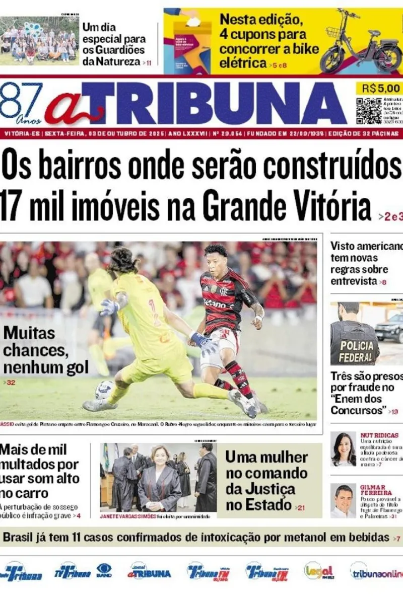 A edição do jornal A Tribuna desta sexta-feira, 03 de outubro, traz em destaque os bairros onde serão construídos 17 mil imóveis na Grande Vitória.