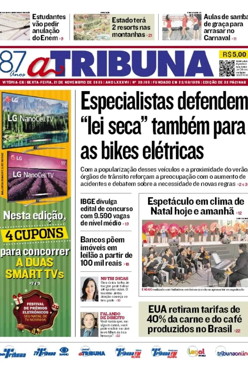 A edição do jornal A Tribuna desta sexta-feira, 21 de novembro, traz em destaque que especialistas defendem "lei seca" também para as bikes elétricas.