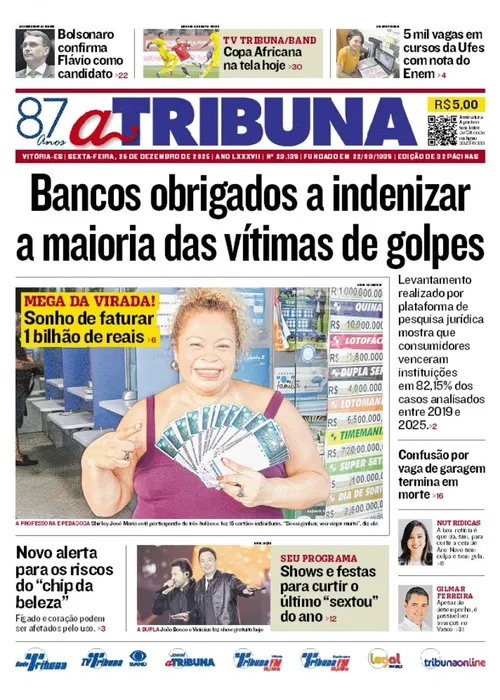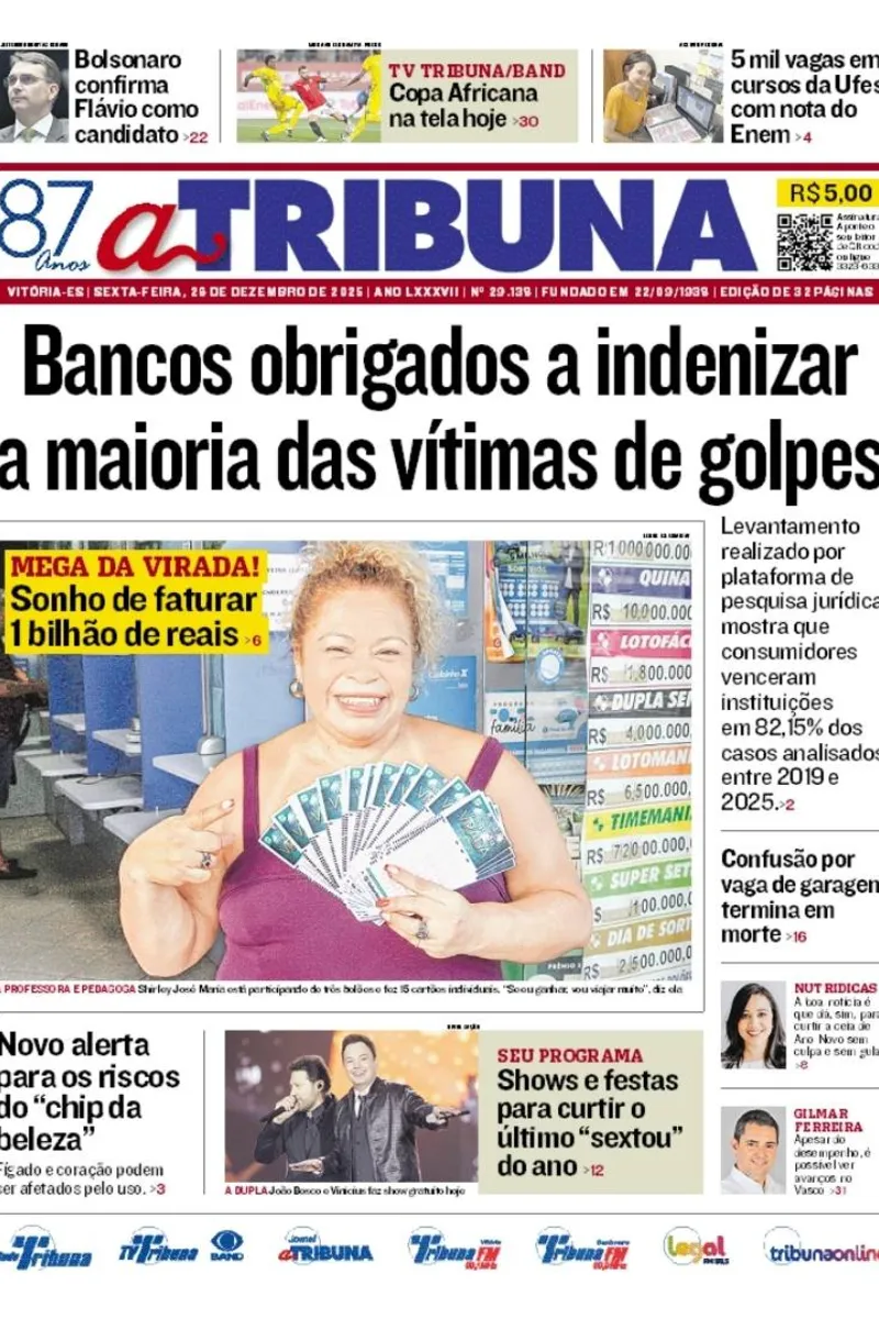 A edição do jornal A Tribuna desta sexta-feira, 26 de dezembro, traz em destaque que bancos são obrigados a indenizar a maioria das vítimas de golpes.
