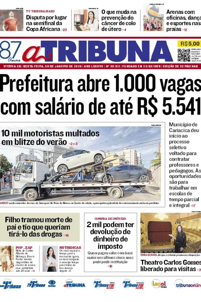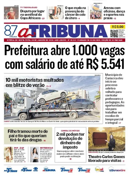 A edição do jornal A Tribuna desta sexta-feira, 09 de janeiro, traz em destaque que a prefeitura abre 1.000 vagas com salário de até R$ 5.541.