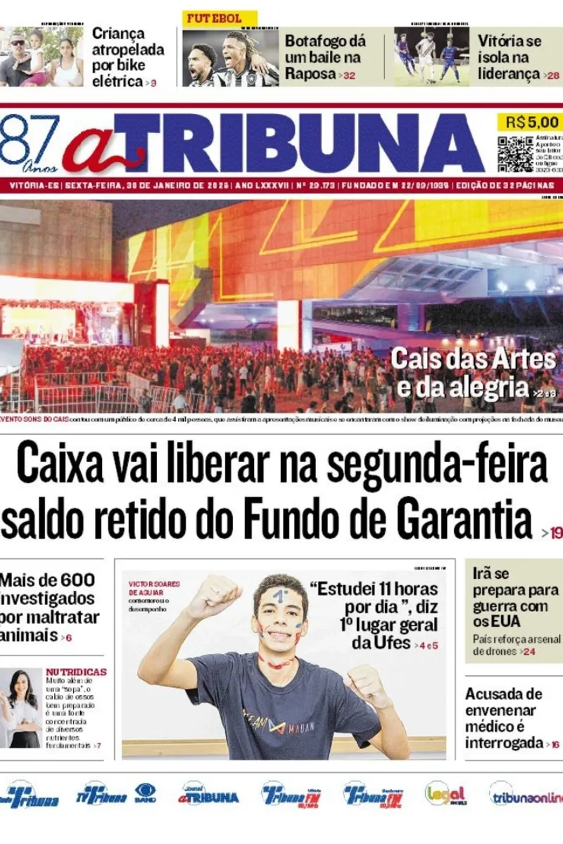 A edição do jornal A Tribuna desta sexta-feira, 30 de janeiro, traz em destaque que Caixa vai liberar na segunda-feira saldo retido do Fundo de Garantia.