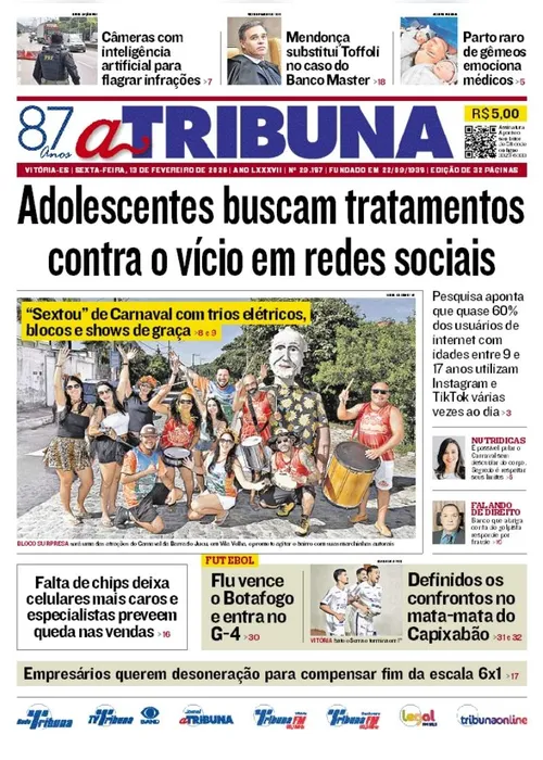 A edição do jornal A Tribuna desta sexta-feira, 13 de fevereiro, traz em destaque que adolescentes buscam tratamentos contra o vício em redes sociais.