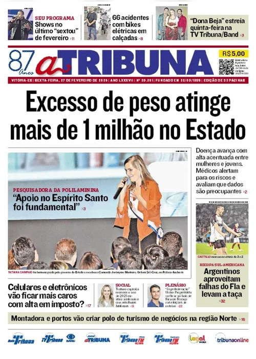 A edição do jornal A Tribuna desta sexta-feira, 27 de fevereiro, traz em destaque que excesso de peso atinge mais de 1 milhão no Estado.