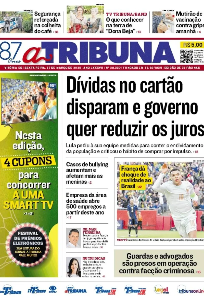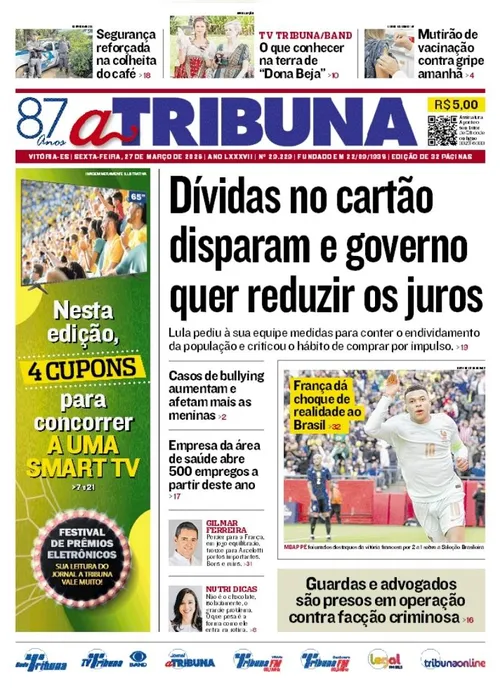 A edição do jornal A Tribuna desta sexta-feira, 27 de março, traz em destaque que dívidas no cartão disparam e governo quer reduzir os juros.