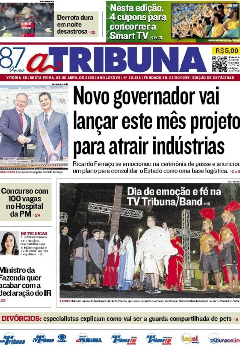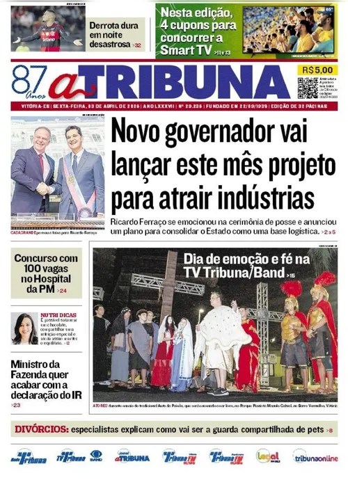 A edição do jornal A Tribuna desta sexta-feira, 3 de abril, traz em destaque que o novo governador vai lançar este mês projeto para atrair indústrias ao Espírito Santo.