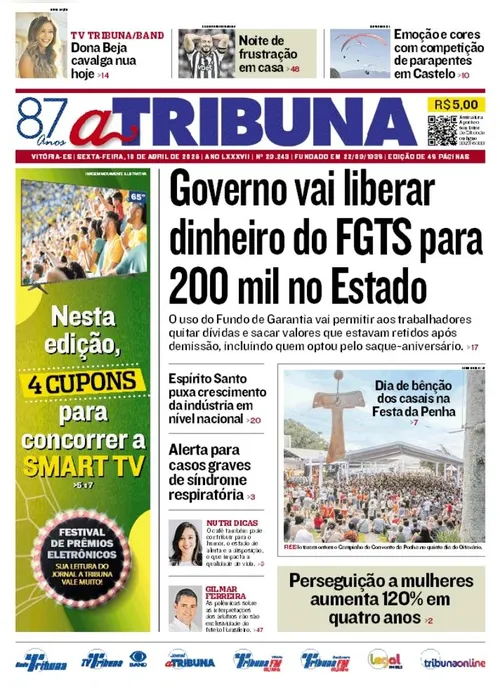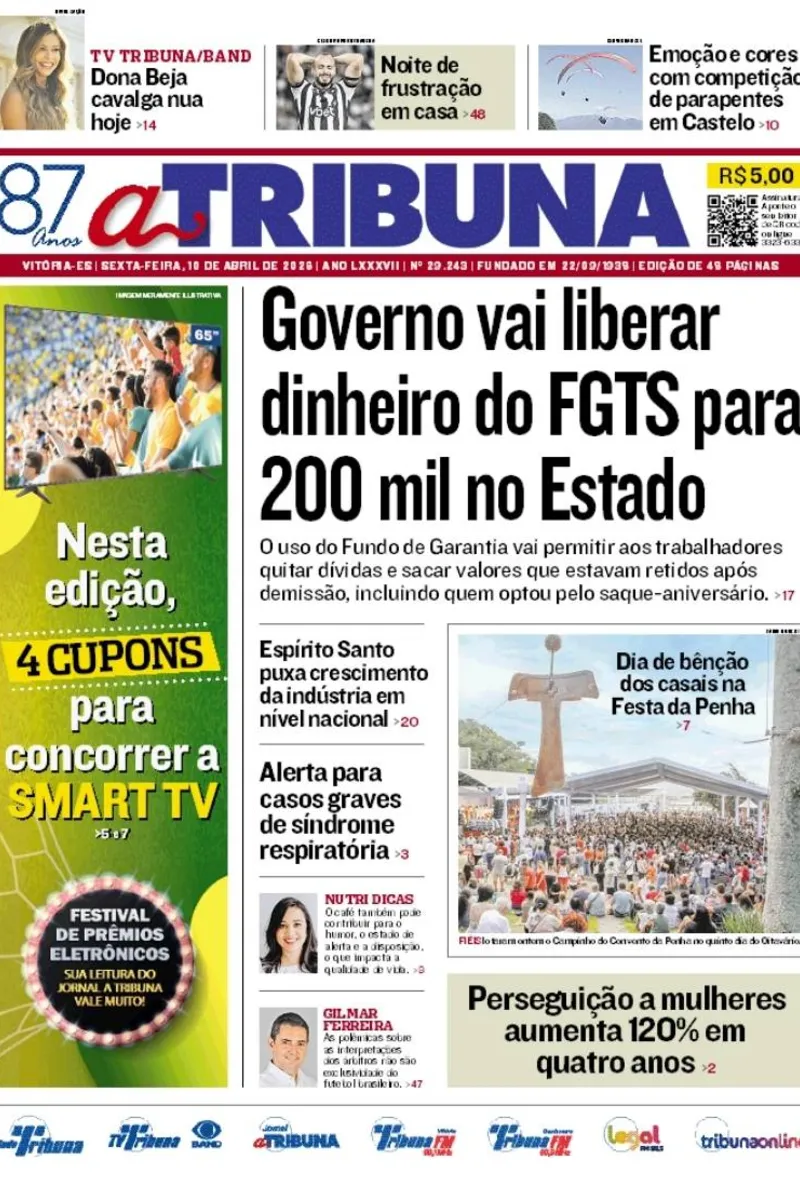 A edição do jornal A Tribuna desta sexta-feira, 10 de abril, traz em destaque que governo vai liberar dinheiro do FGTS para 200 mil no Estado.