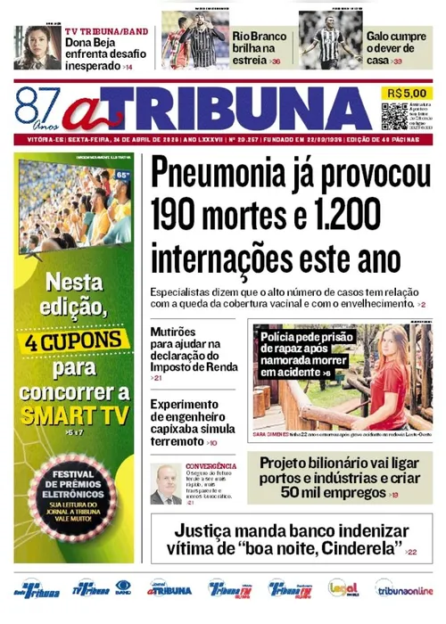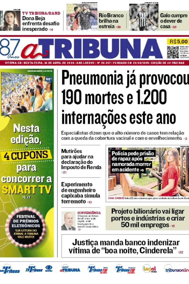 A edição do jornal A Tribuna desta sexta-feira, 24 de abril, traz em destaque que pneumonia já provocou 190 mortes e 1.200 internações este ano.