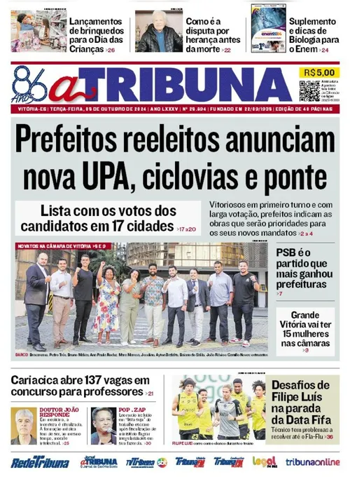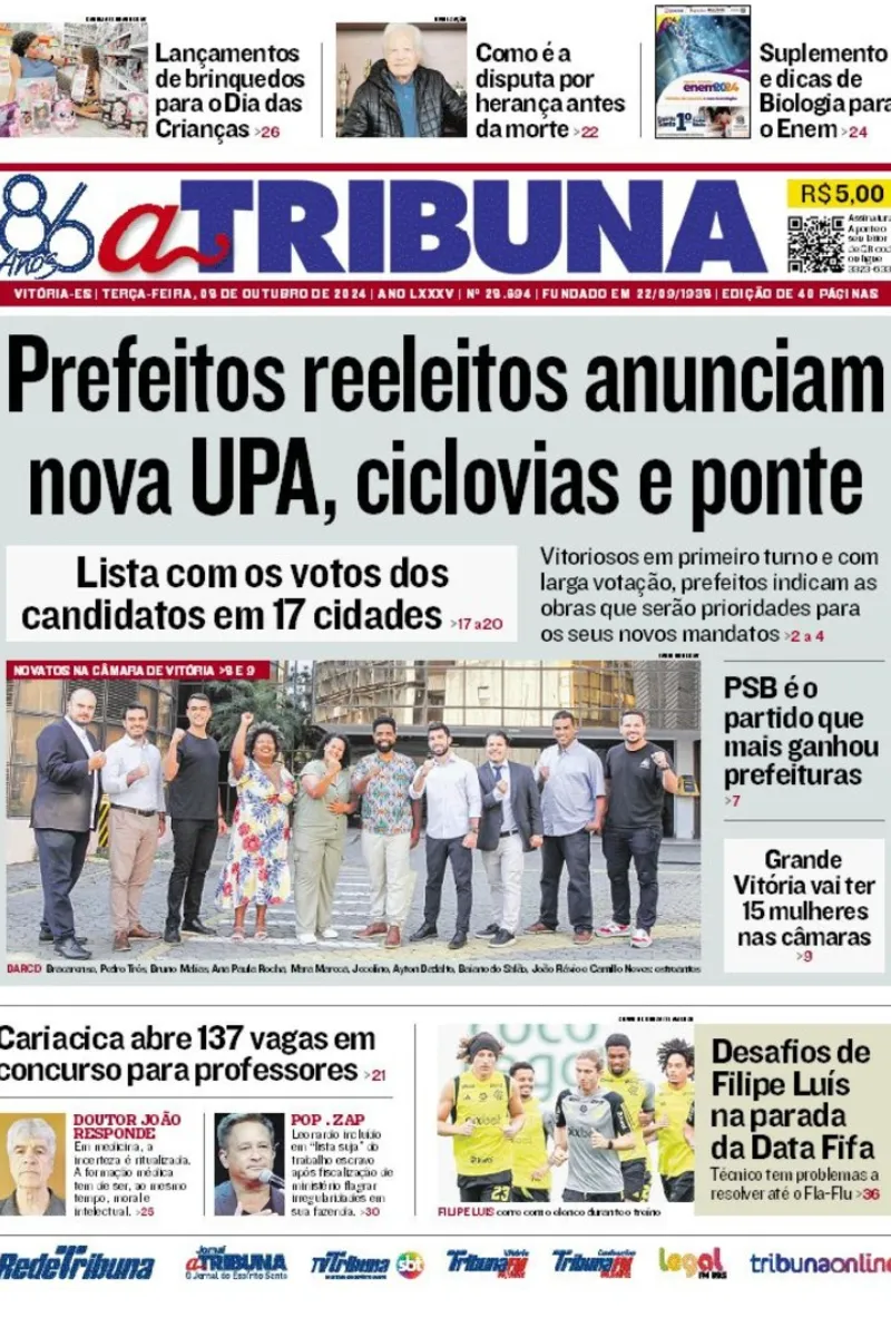 A edição do jornal A Tribuna desta terça-feira, dia 08 de outubro, traz em destaque que prefeitos reeleitos no ES anunciam nova UPA, ciclovias e ponte.