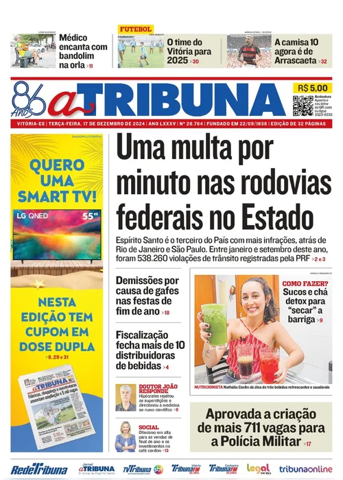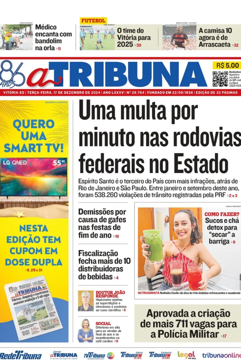 A edição do jornal A Tribuna desta terça-feira, dia 17 de dezembro, destaca uma multa por minuto nas rodovias federais no Estado.