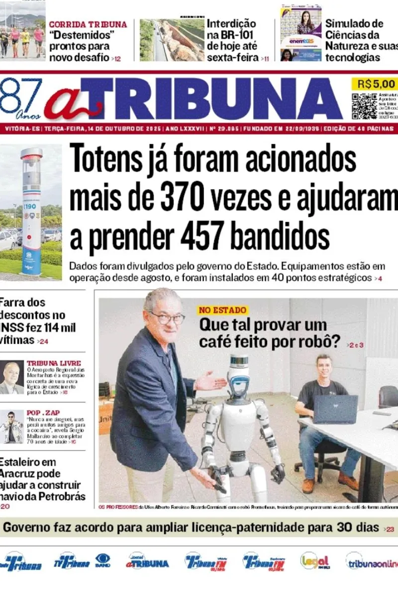A edição do jornal A Tribuna desta terça-feira, 14 de outubro, traz em destaque que totens já foram acionados mais de 370 vezes e ajudaram a prender 457 bandidos.
