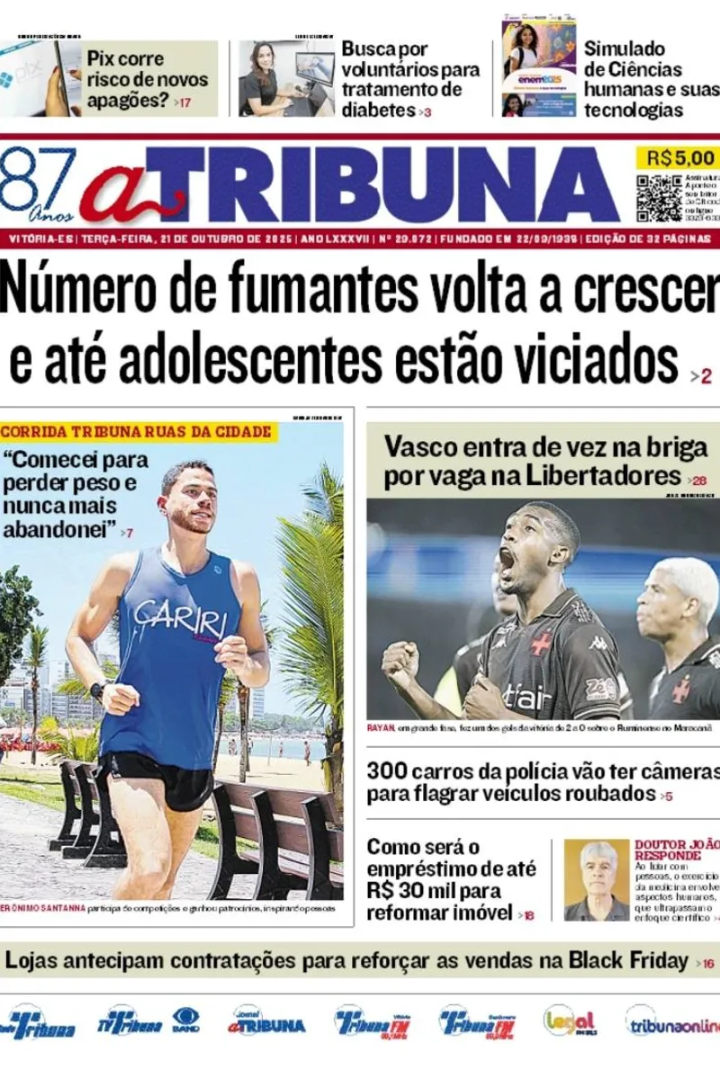 A edição do jornal A Tribuna desta terça-feira, 21 de outubro, traz em destaque que número de fumantes volta a crescer e até adolescentes estão viciados.