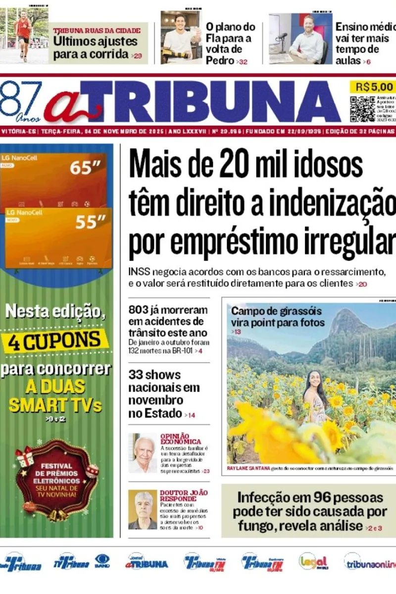 A edição do jornal A Tribuna desta terça-feira, 04 de novembro, traz em destaque que mais de 20 mil idosos têm direito a indenização por empréstimo irregular.