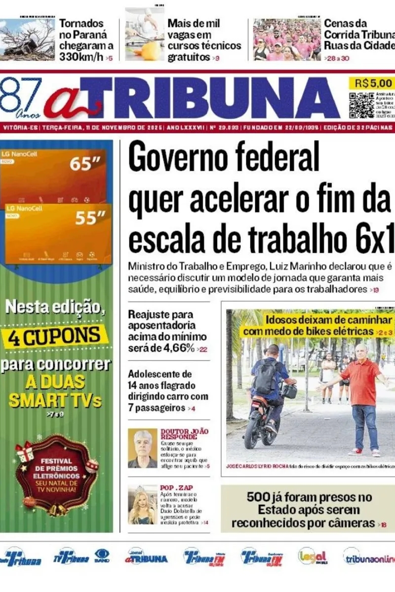 A edição do jornal A Tribuna desta terça-feira, 11 de novembro, traz em destaque que o Governo federal quer acelerar o fim da escala de trabalho 6x1.