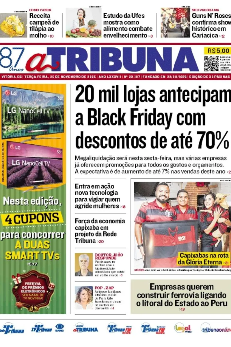 A edição do jornal A Tribuna desta terça-feira, 25 de novembro, traz em destaque que 20 mil lojas antecipam a Black Friday com descontos de até 70%.