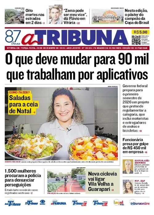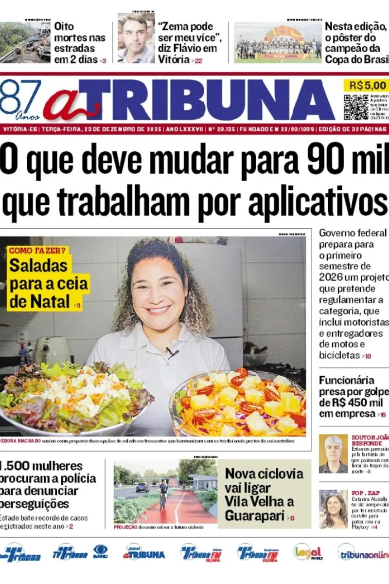 A edição do jornal A Tribuna desta terça-feira, 23 de dezembro, traz em destaque o que deve mudar para 90 mil que trabalham por aplicativos.