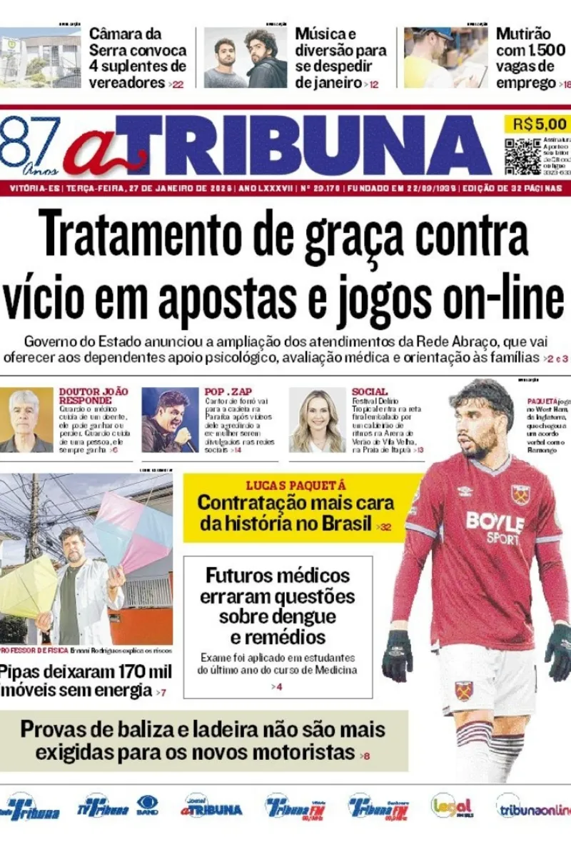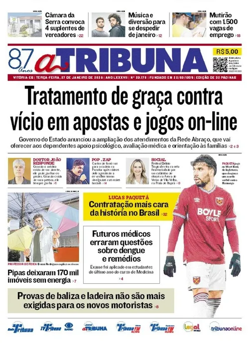 A edição do jornal A Tribuna desta terça-feira, 27 de janeiro, traz em destaque tratamento de graça contra vício em apostas e jogos on-line.