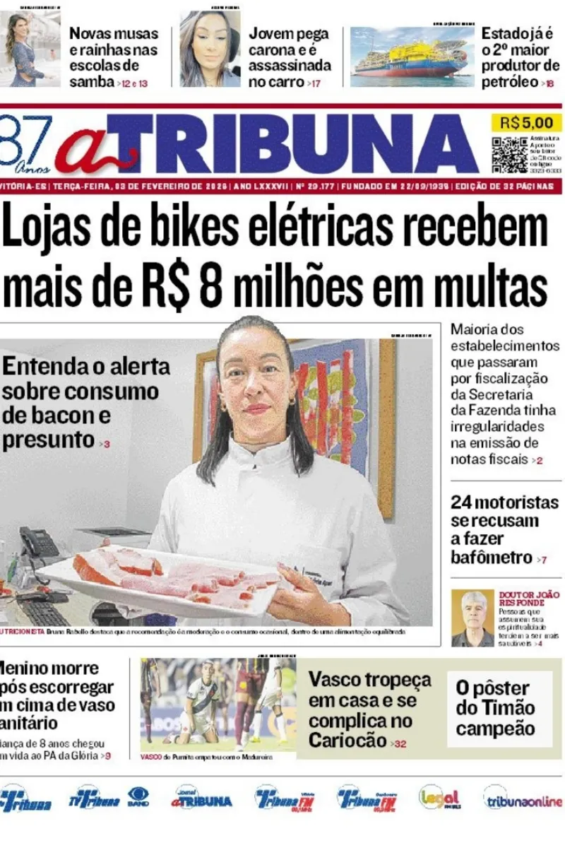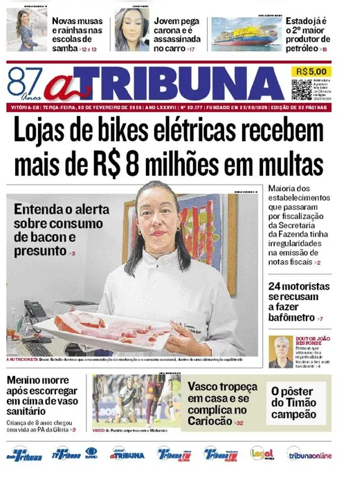 A edição do jornal A Tribuna desta terça-feira, 03 de janeiro, traz em destaque que lojas de bikes elétricas recebem mais de R$ 8 milhões em multas.