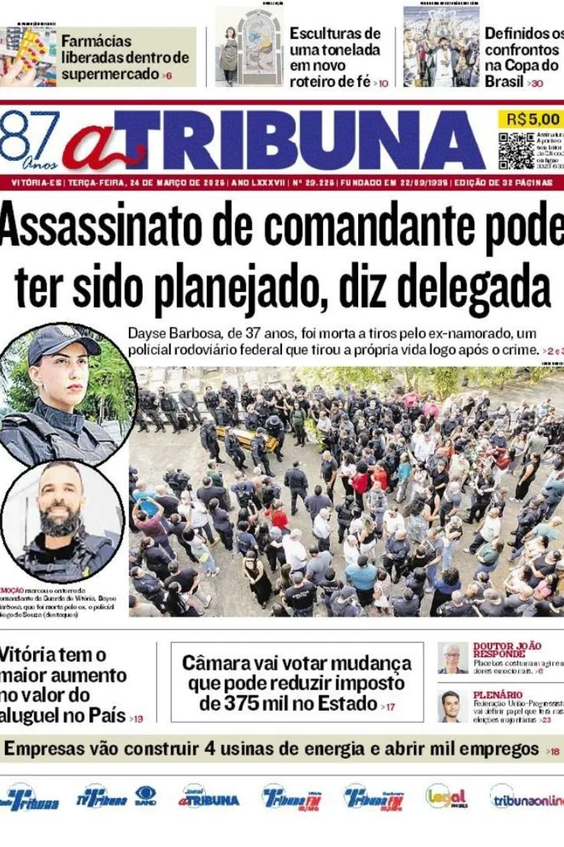 A edição do jornal A Tribuna desta terça-feira, 24 de março, traz em destaque que o assassinato da comandante da Gu arda Municipal de Vitória pode ter sido planejado, diz delegada.