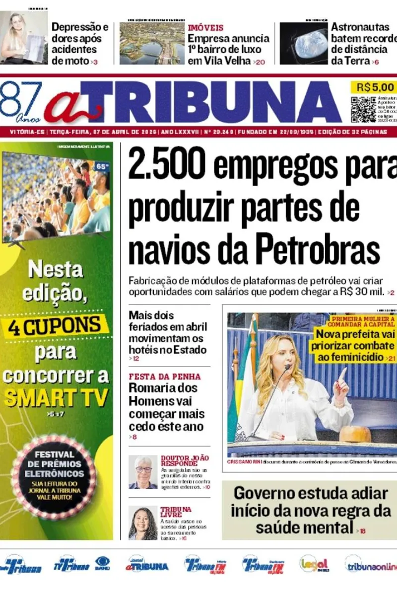 A edição do jornal A Tribuna desta terça-feira, 7 de abril, traz em destaque 2.500 empregos para produzir partes de navios da Petrobras.