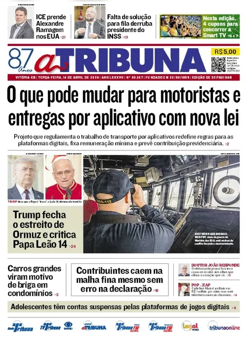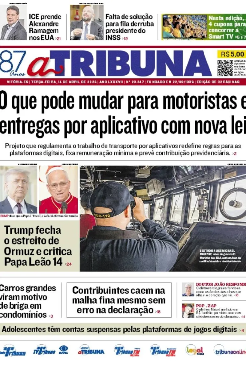A edição do jornal A Tribuna desta terça-feira, 14 de abril, traz em destaque o que pode mudar para motoristas e entregas por aplicativo com nova lei.