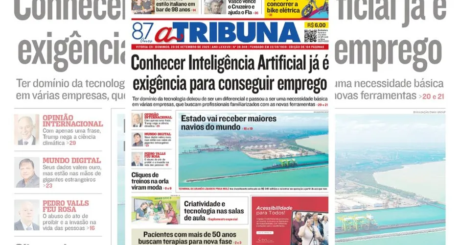 A edição do jornal A Tribuna deste domingo, dia 28 de setembro, traz em destaque que conhecer Inteligência Artificial já é exigência para conseguir emprego.