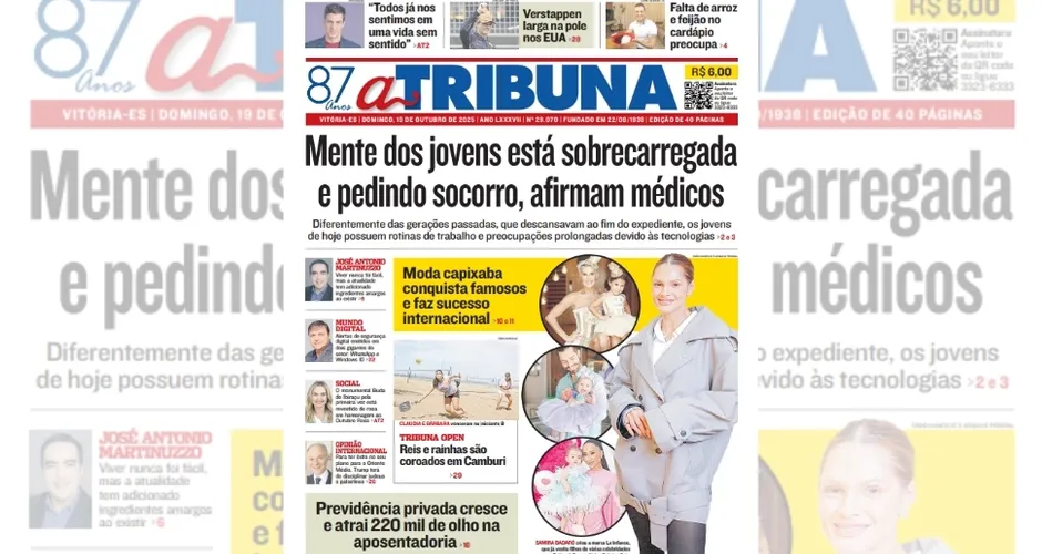 A edição do jornal A Tribuna deste domingo (19) traz em destaque que a mente dos jovens está sobrecarregada e pedindo socorro, afirmam médicos. Diferentemente das gerações passadas, que descansavam ao fim do expediente, os jovens de hoje possuem rotinas de trabalho e preocupações prolongadas devido às tecnologias.