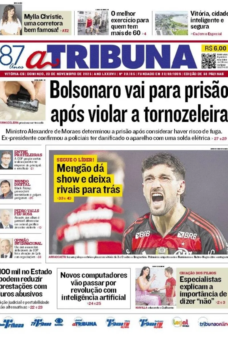 A edição do jornal A Tribuna deste domingo, 23 de novembro, traz em destaque que Bolsonaro vai para prisão após violar a tornozeleira.