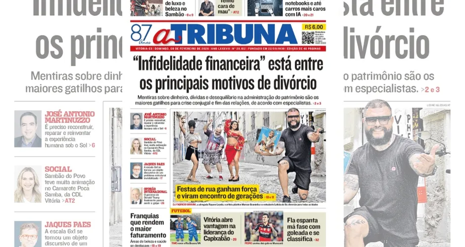 A edição do jornal A Tribuna deste domingo, dia 08 de fevereiro, traz em destaque que "infidelidade financeira" está entre os principais motivos de divórcio.