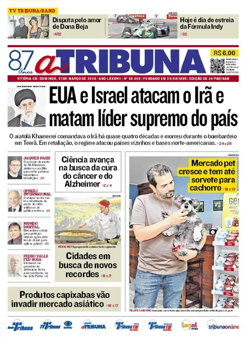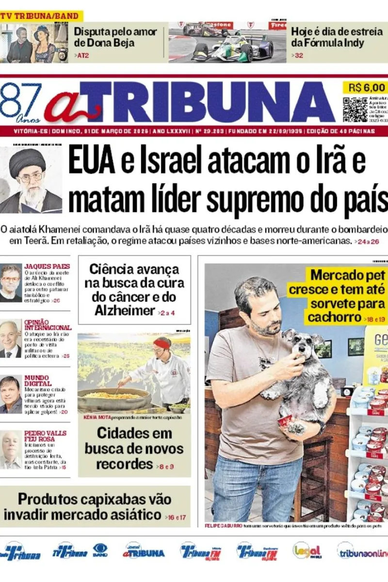 A edição do jornal A Tribuna deste domingo, 1º de março, traz em destaque que EUA e Israel atacam o Irã e matam líder supremo do país.