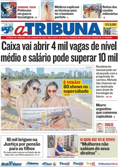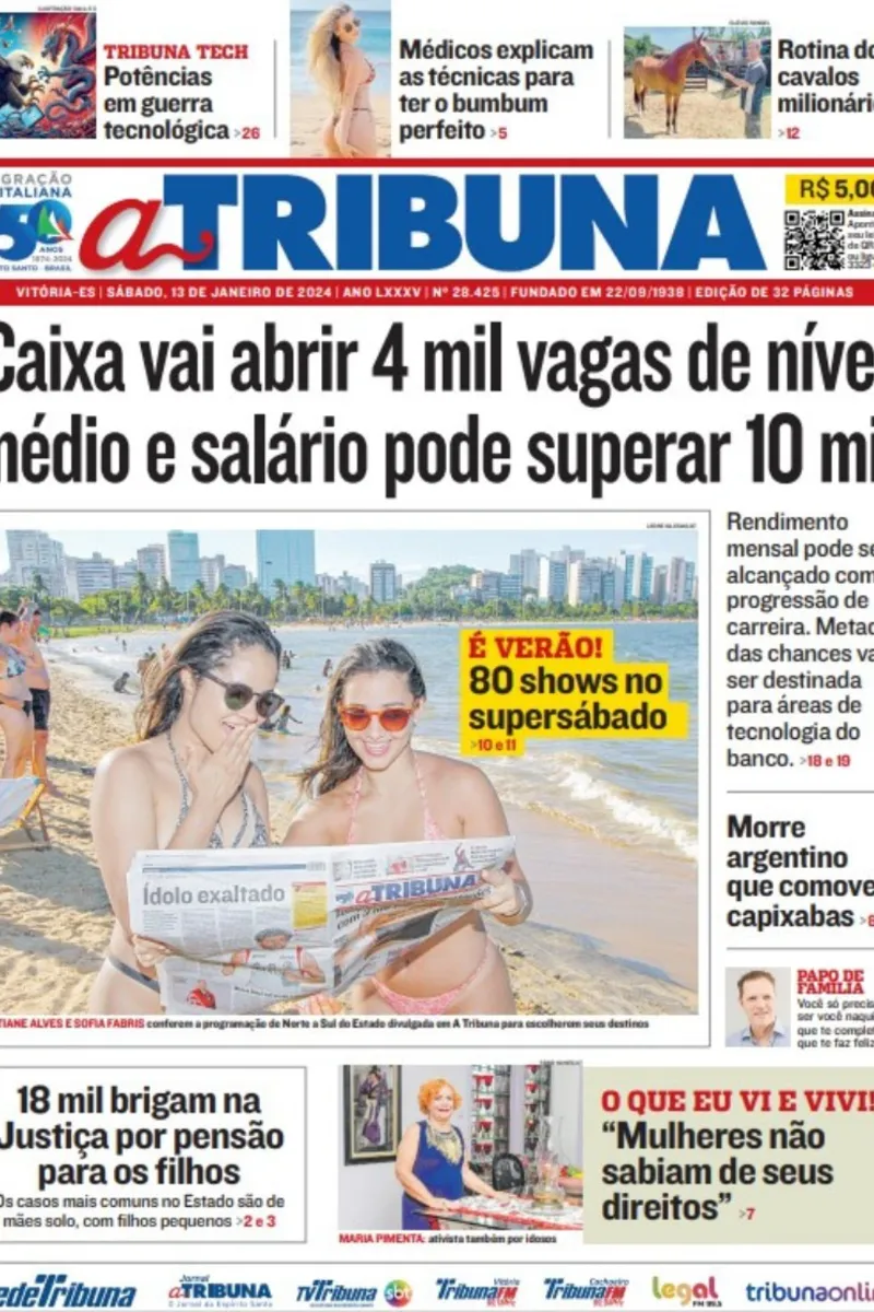 A edição do jornal A Tribuna deste sábado, dia 13 de janeiro, traz em destaque que a Caixa vai abrir 4 mil vagas de nível médio e com salário que pode superar R$ 10 mil.
