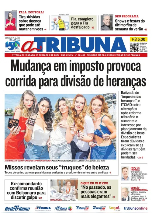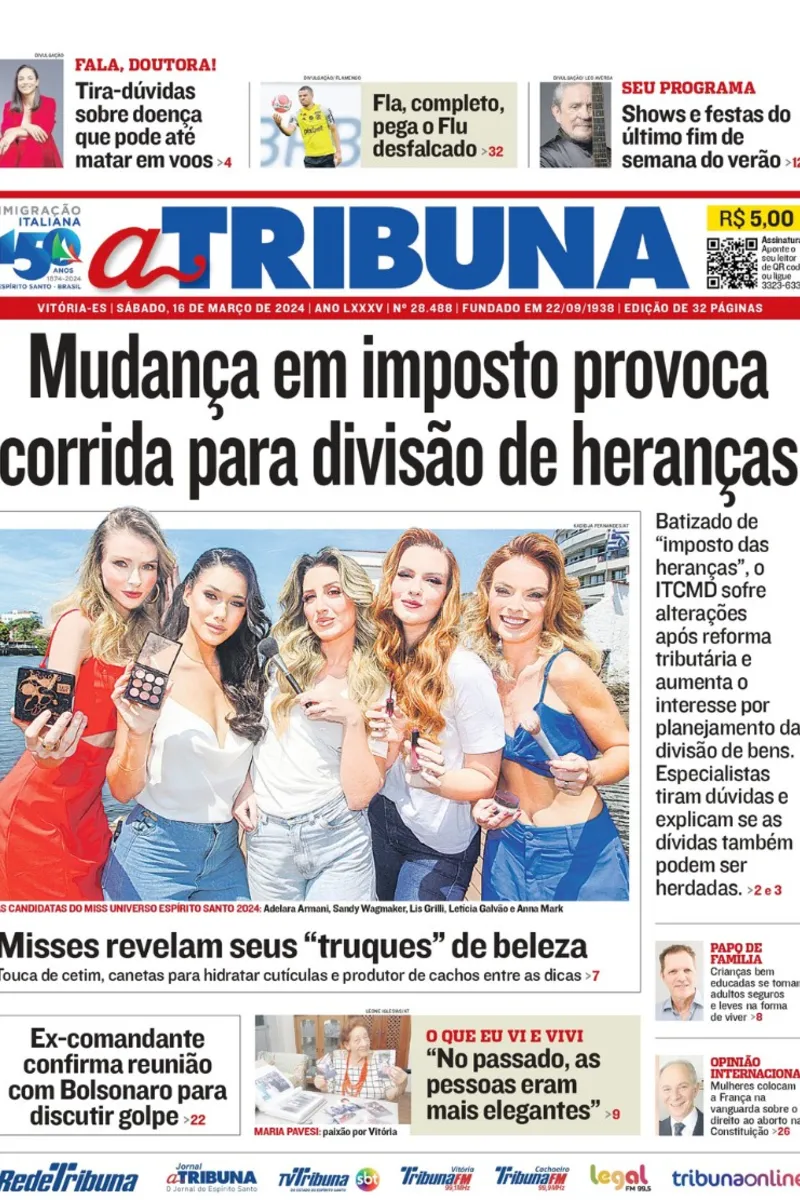 A edição do jornal A Tribuna deste sábado, dia 16 de março, traz em destaque que "Mudança em imposto provoca corrida para divisão de heranças".