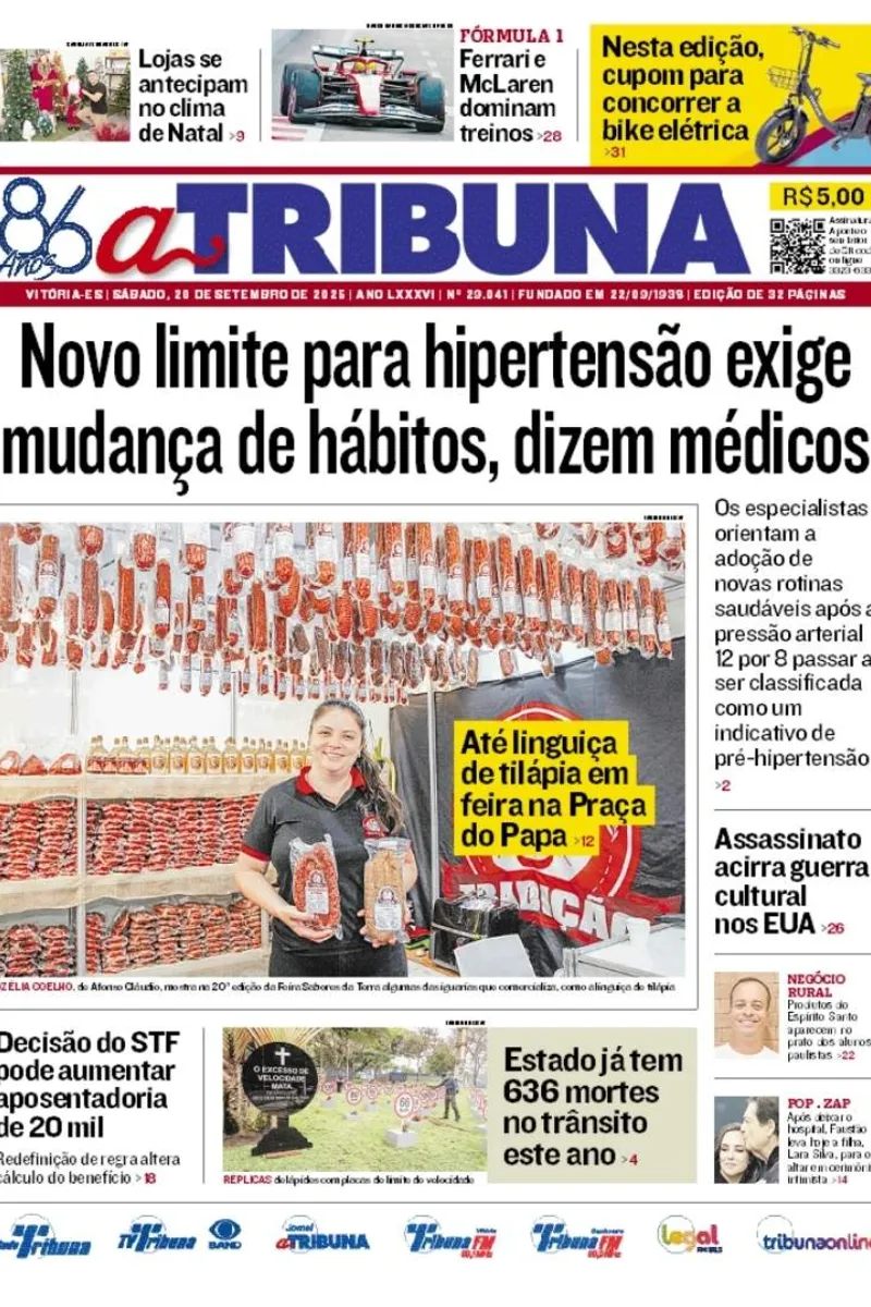 A edição do jornal A Tribuna deste sábado, 20 de setembro, traz em destaque que novo limite para hipertensão exige mudança de hábitos, dizem médicos.