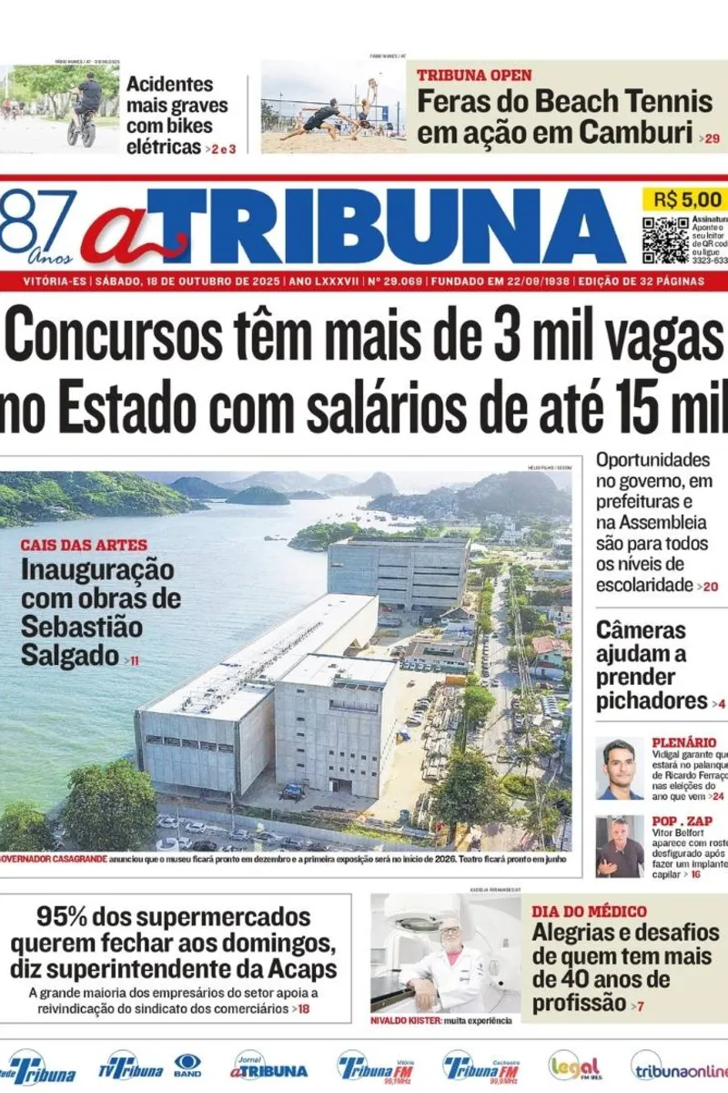 A edição do jornal A Tribuna deste sábado, 18 de outubro, traz em destaque que concursos têm mais de 3 mil vagas no Estado com salários de até 15 mil.
