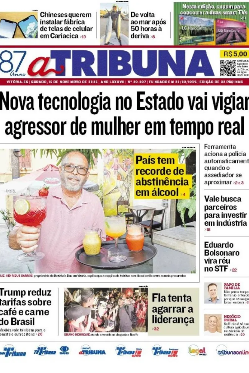 A edição do jornal A Tribuna deste sábado, 15 de novembro, traz em destaque que nova tecnologia vai vigiar agressor de mulher em tempo real. Ferramenta aciona a polícia automaticamente quando o assediador se aproximar.