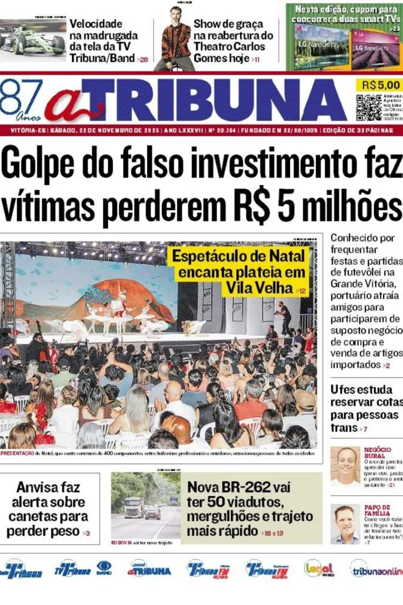 A edição do jornal A Tribuna deste sábado, 22 de novembro, traz em destaque o golpe do falso investimento, que faz vítimas perderem R$ 5 milhões.