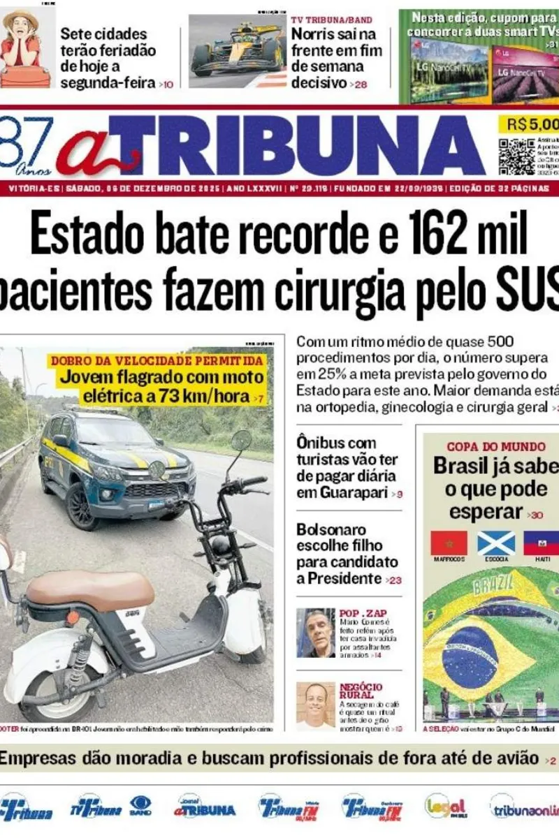 A edição do jornal A Tribuna deste sábado, 06 de dezembro, traz em destaque que Estado bate recorde e 162 mil pacientes fazem cirurgia pelo SUS.