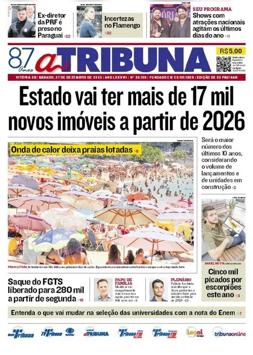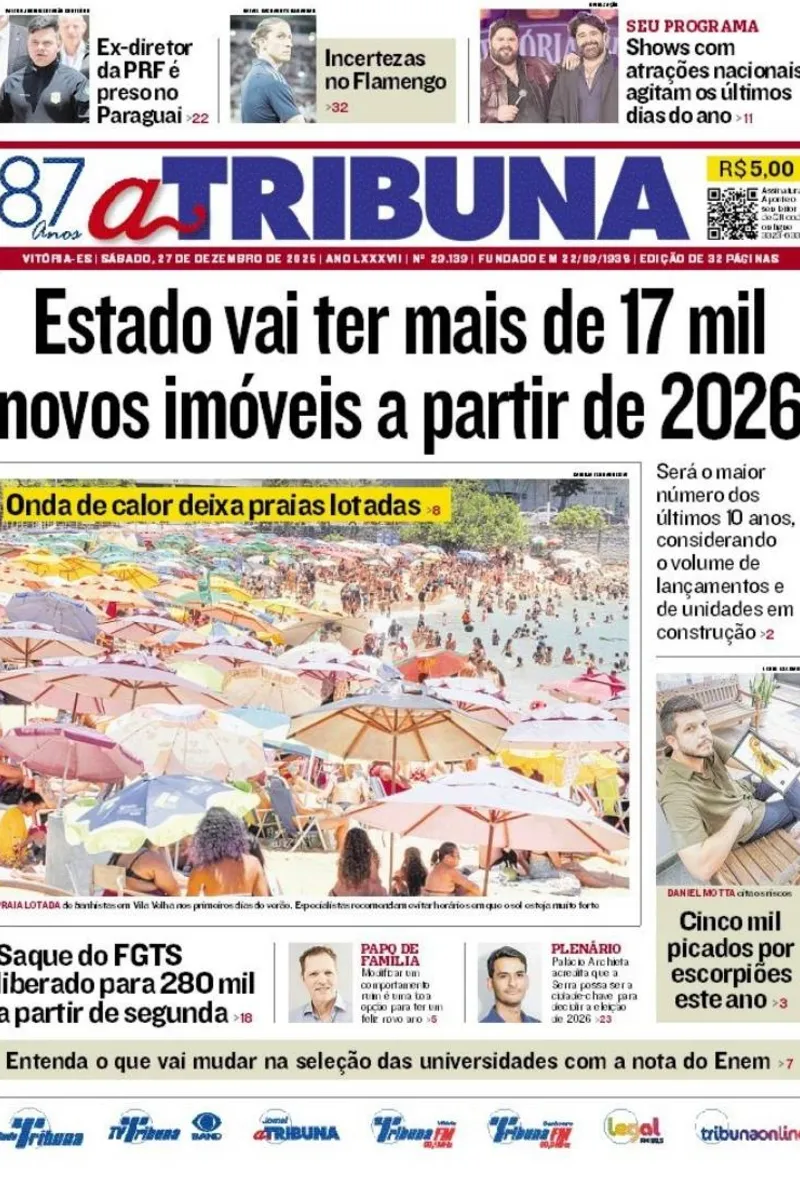A edição do jornal A Tribuna deste sábado, 27 de dezembro, traz em destaques que Estado vai ter mais de 17 mil novos imóveis a partir de 2026.