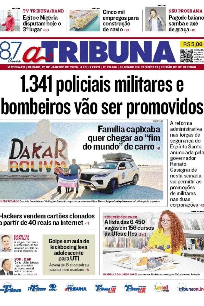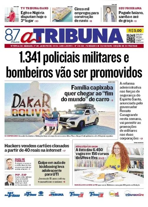 A edição do jornal A Tribuna deste sábado, 17 de janeiro, traz em destaque que 1.341 policiais militares e bombeiros vão ser promovidos no Estado.
