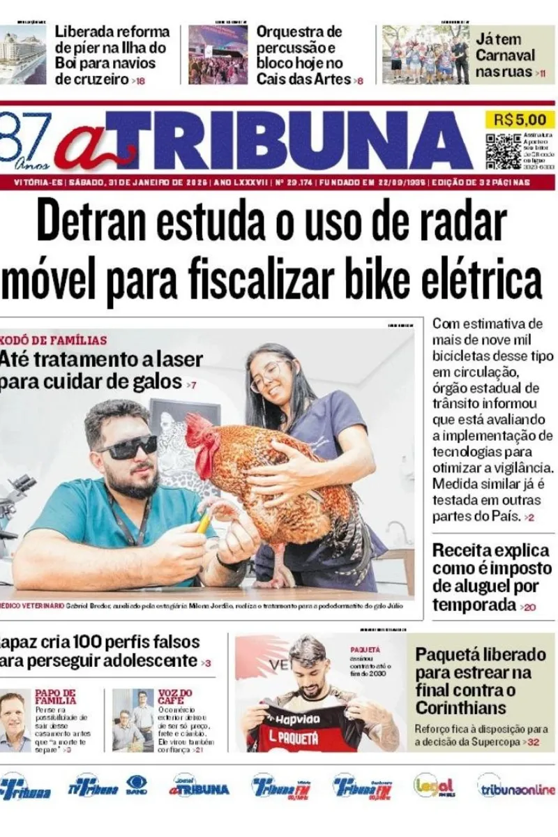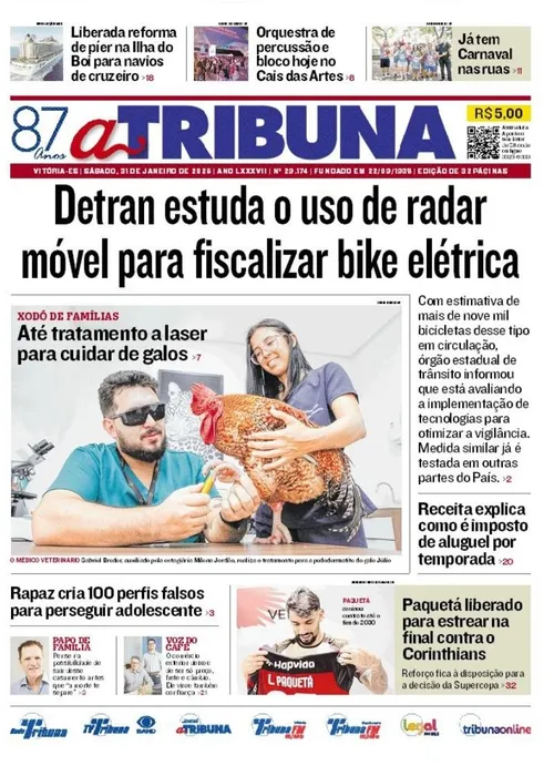 A edição do jornal A Tribuna deste sábado, 31 de janeiro, traz em destaque que Detran estuda o uso de radar móvel para fiscalizar bike elétrica.
