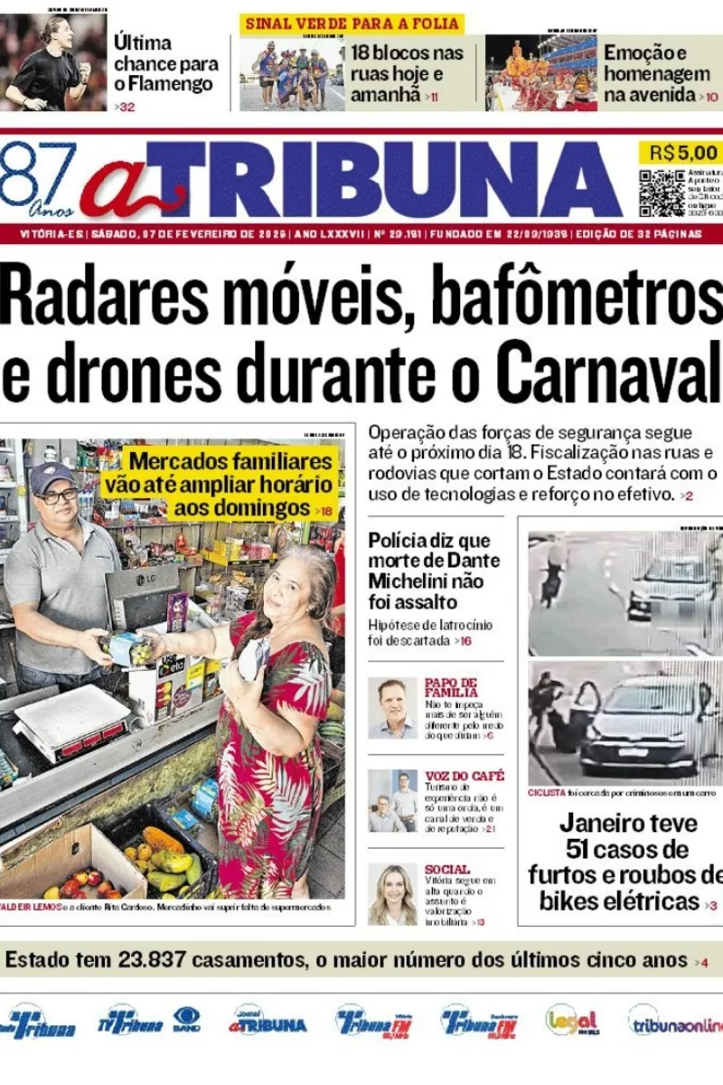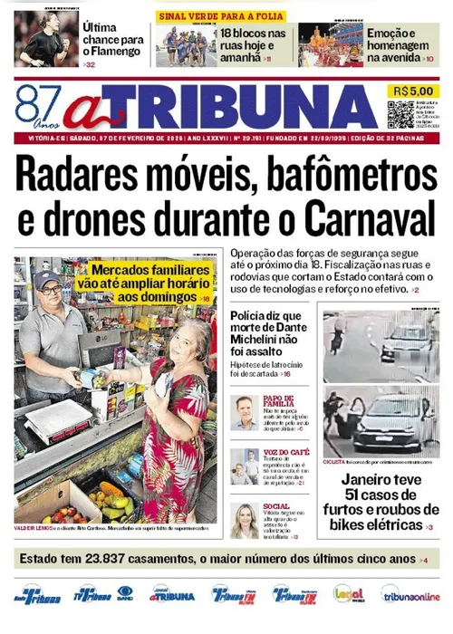 A edição do jornal A Tribuna deste sábado traz em destaque radares móveis, bafômetros e drones durante o Carnaval.