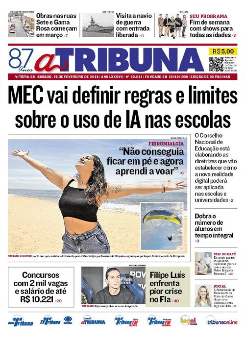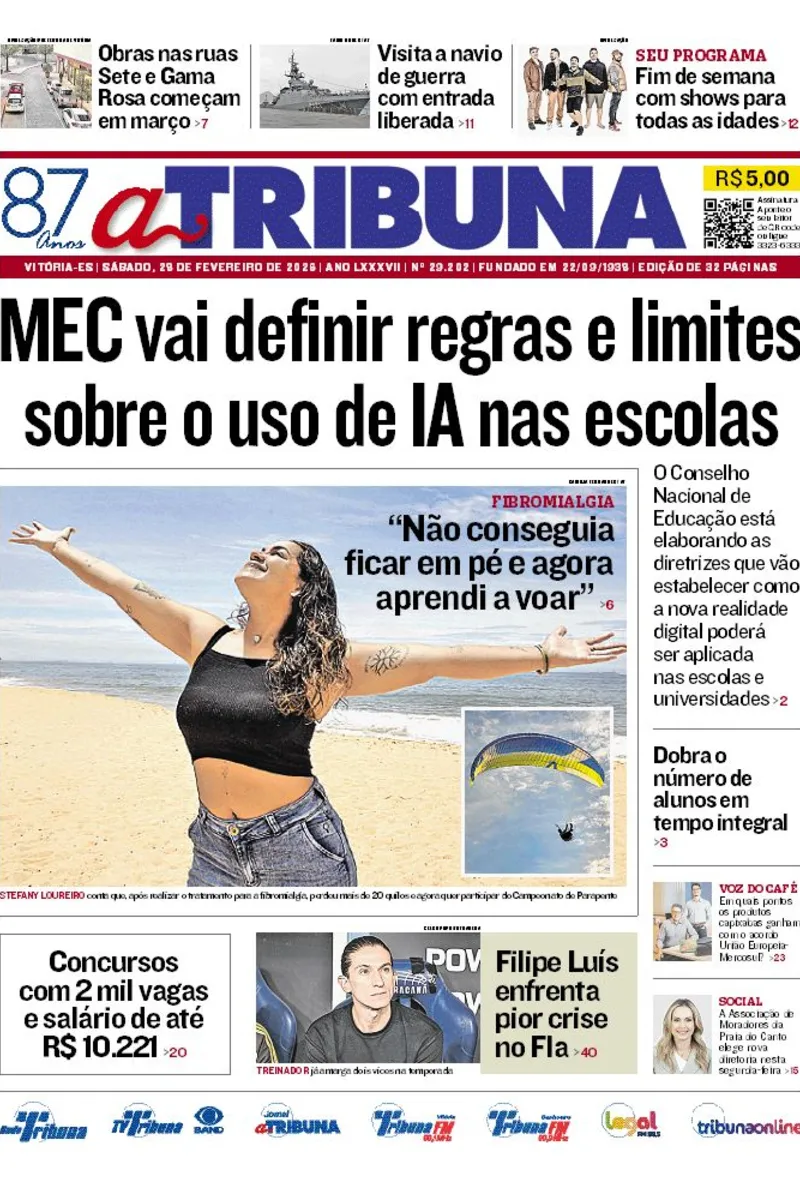 A edição do jornal A Tribuna deste sábado, 28 de fevereiro, traz em destaque que MEC vai definir regras e limites sobre o uso de IA nas escolas.