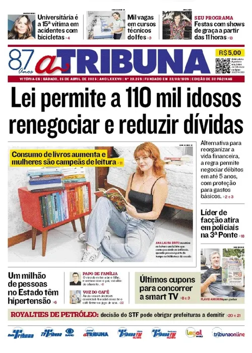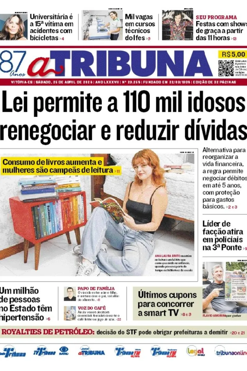 A edição do jornal A Tribuna deste sábado, 25 de abril, traz em destaque que lei permite a 110 mil idosos renegociar e reduzir dívidas.