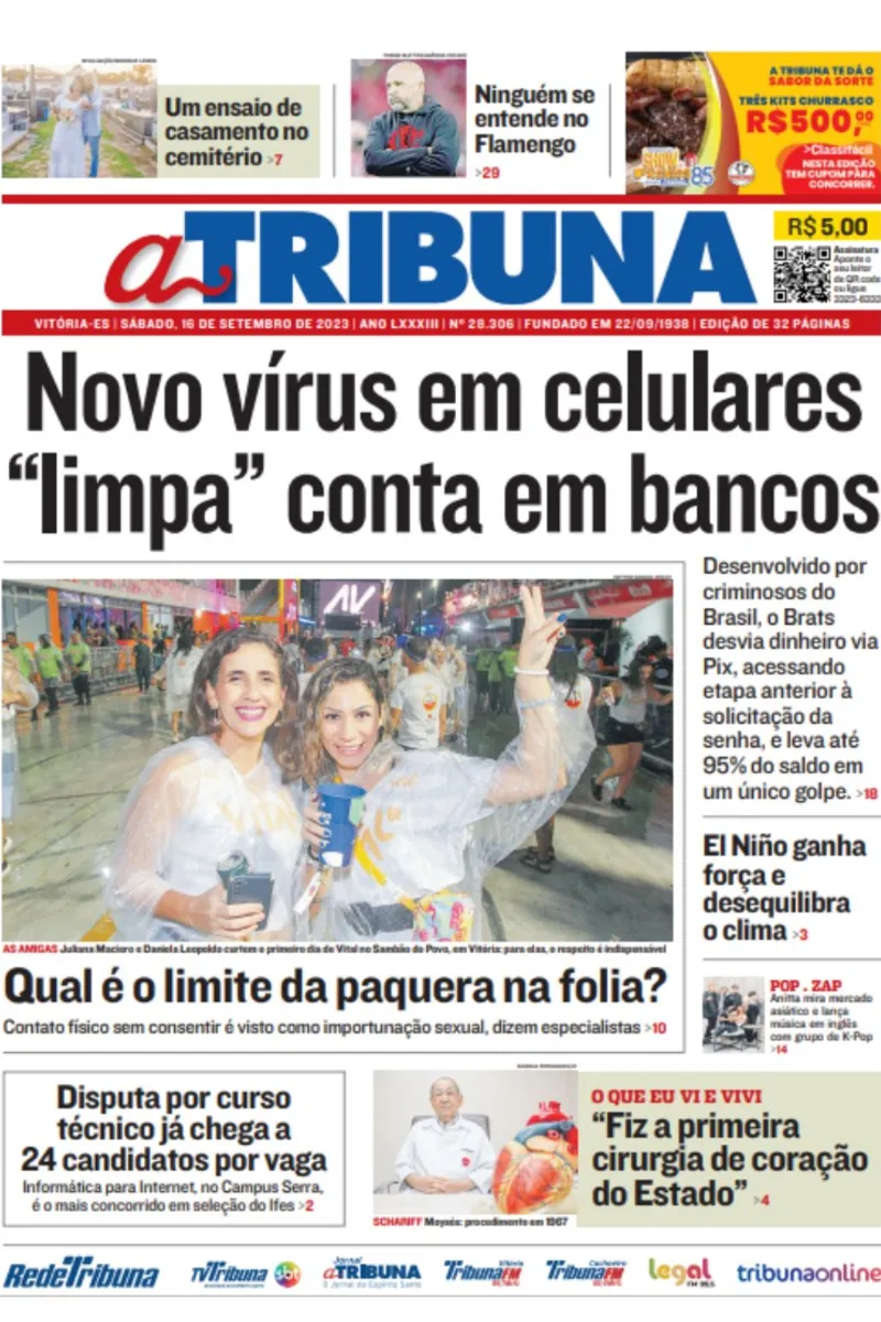 O jornal A Tribuna deste sábado, dia 16 de setembro de 2023, traz em destaque um alerta: um novo vírus que ataca os celulares e que pode "limpar" a sua conta bancária.