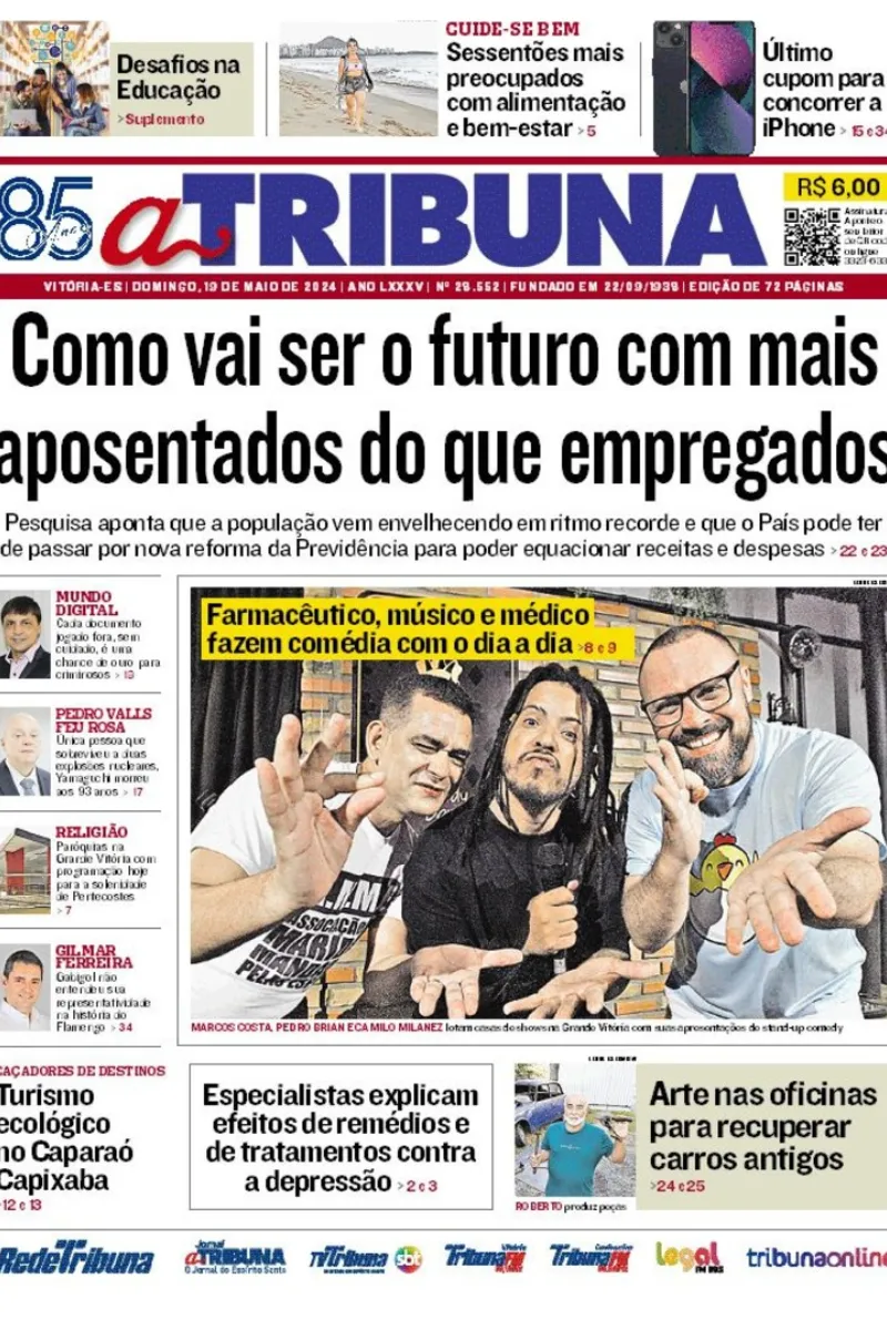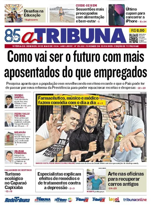 A edição do jornal A Tribuna desta sexta-feira, dia 17 de maio, traz em destaque como vai ser o futuro com mais aposentados do que trabalhadores. Uma pesquisa aponta que a população vem envelhecendo em ritmo recorde e que o País pode ter de passar por nova reforma da Previdência para poder equacionar receitas e despesas.