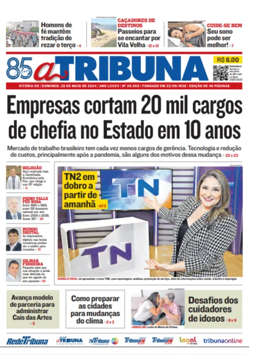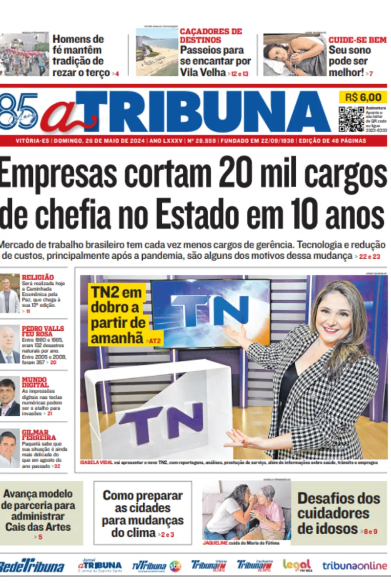 O jornal A Tribuna deste domingo, dia 26 de maio de 2024, traz em destaque que as empresas as empresas cortam 20 mil cargos de chefia no Espírito Santo em 10 anos. Mercado de trabalho brasileiro tem cada vez menos cargos de gerência. Tecnologia e redução de custos, principalmente após a pandemia, são alguns dos motivos dessa mudança.