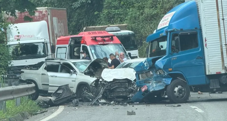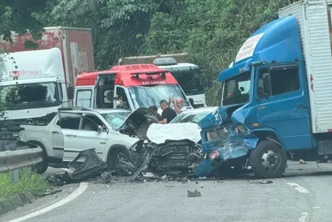 Um grave acidente de trânsito envolvendo três veículos – um caminhão de pequeno porte, um Volkswagen Polo e uma Fiat Toro – foi registrado na tarde desta quarta-feira (25) na BR-262, nas proximidades do Mirante de Viana.