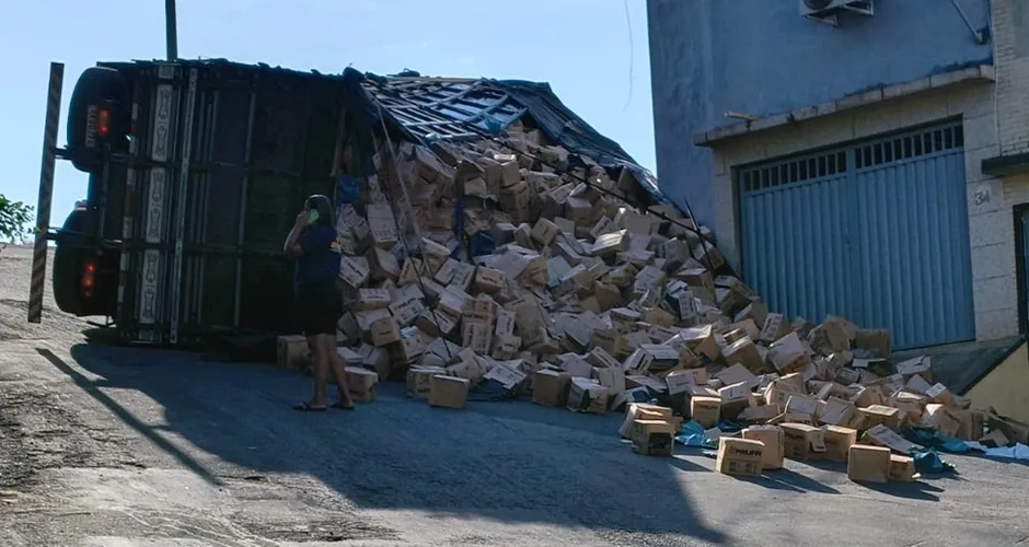 Um caminhão que transportava sacolas plásticas tombou e bloqueou temporariamente uma rua no bairro Santo André, em Cariacica, na manhã desta segunda-feira (13). De acordo com a Inspetoria de Trânsito do município, o veículo teria perdido forças ao subir a via, fazendo com que a carga se inclinasse para um dos lados do caminhão.
