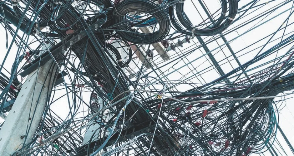 Poluição visual é provocada pela fiação excedente, muitas vezes abandonada por operadoras de telefonia, TV e internet
