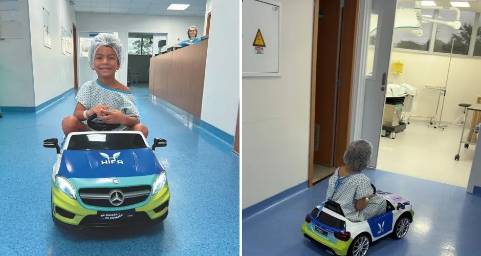 > O projeto disponibiliza um carrinho elétrico para que os pacientes pediátricos façam o trajeto até o centro cirúrgico de forma mais leve, transformando um momento de tensão em uma experiência mais acolhedora.
