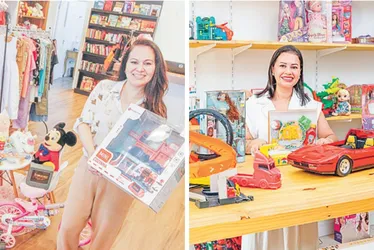 Elki Zanandrea, do Peça Rara, mostra algumas opções de presentes. Viviane dos Santos, do Brinquechó, diz que brinquedos da moda são mais procurados |  Foto: Leone Iglesias/at e divulgação